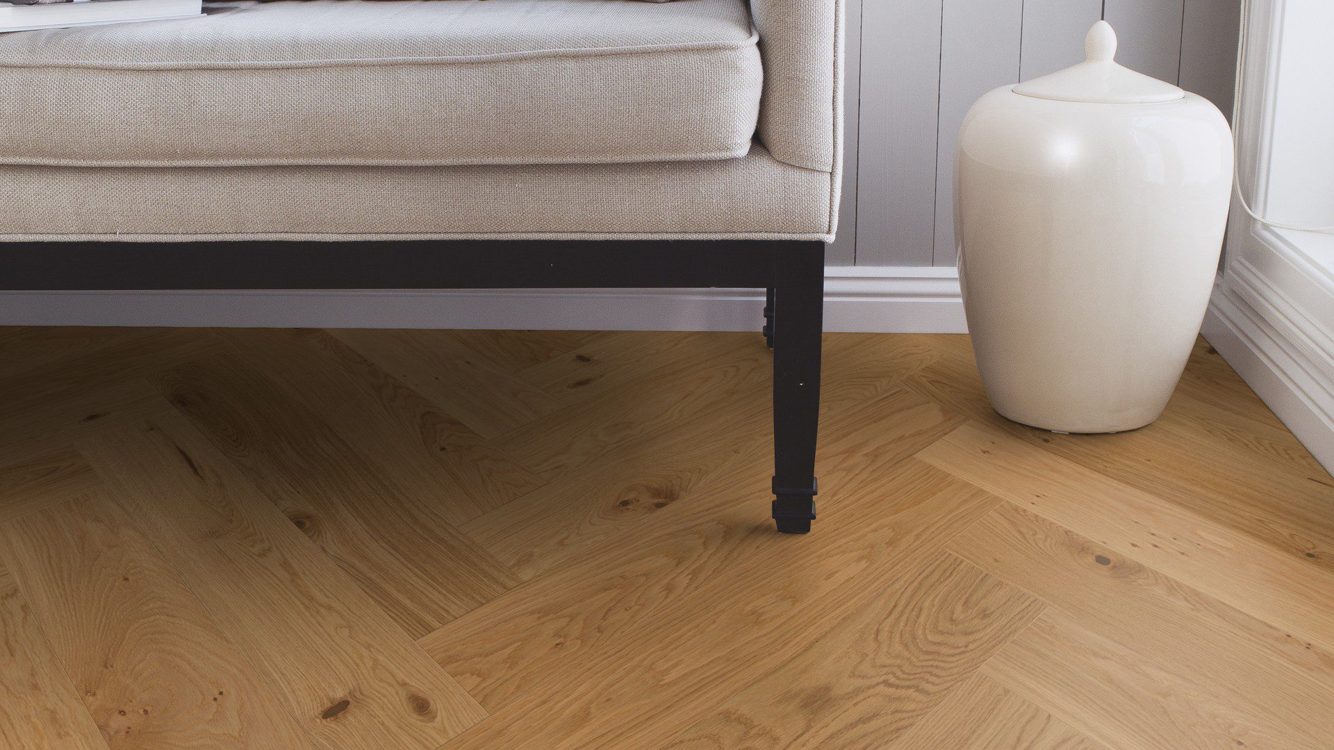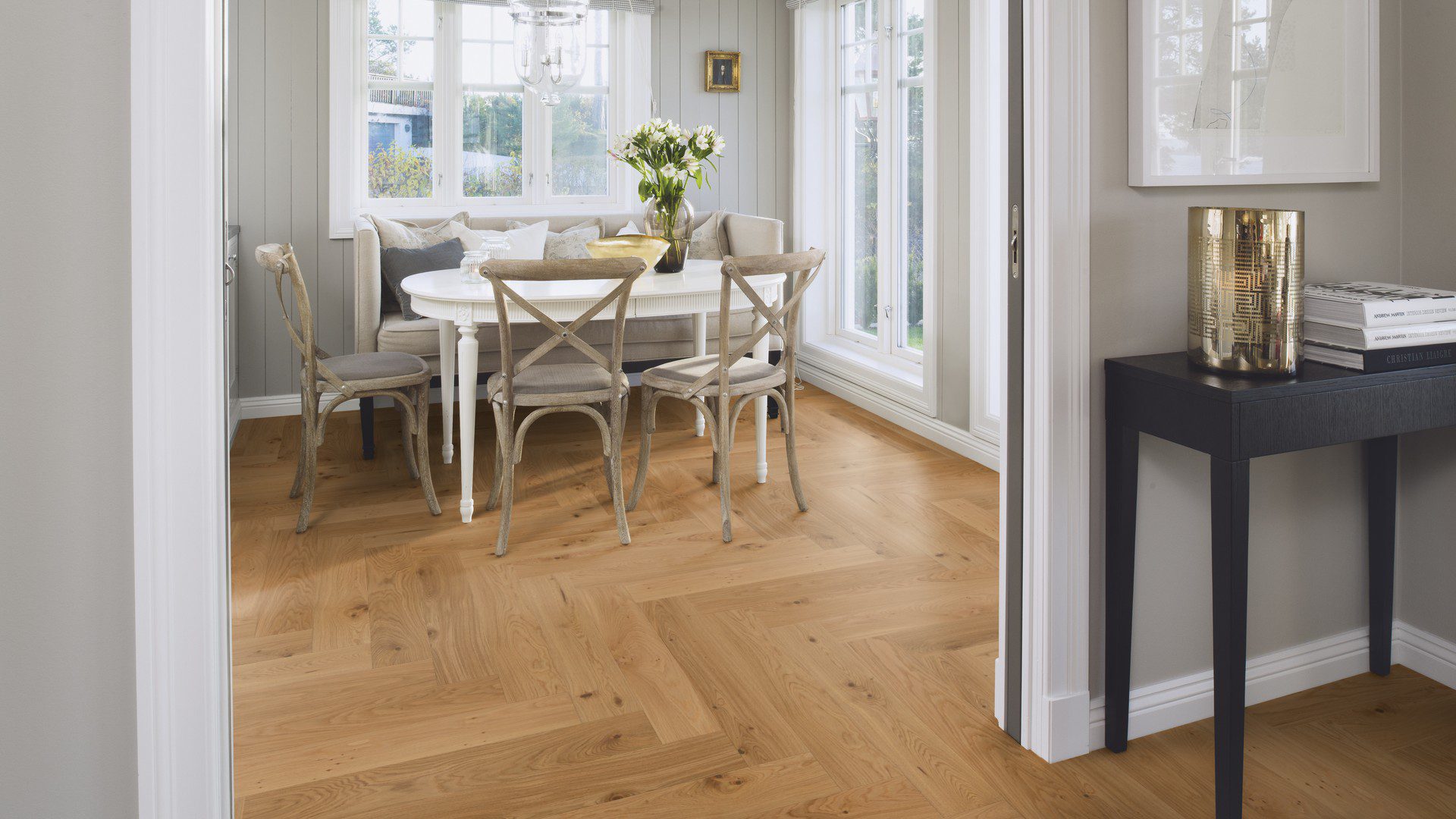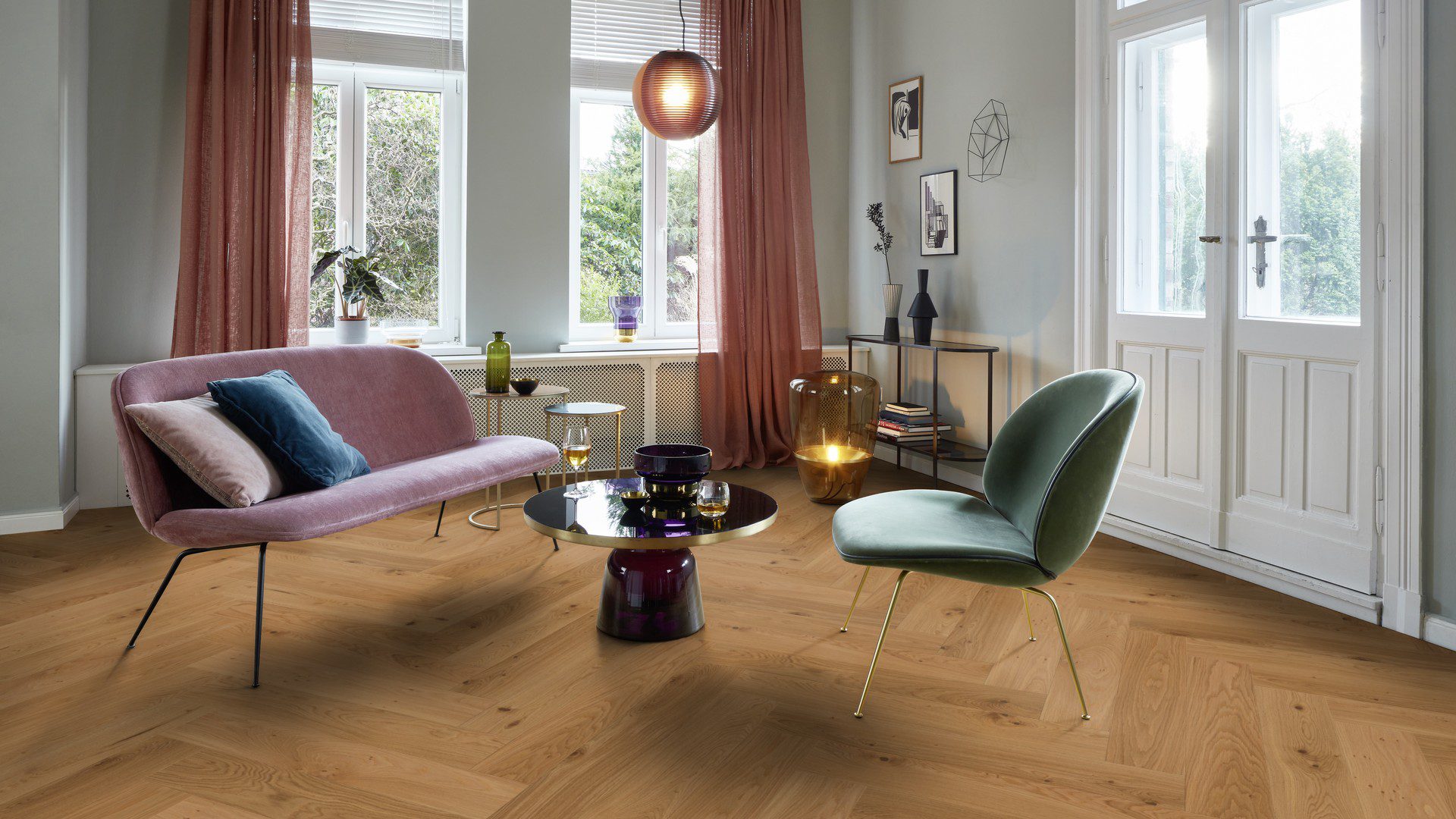 Dieses Fischgrätparkett eignet sich perfekt für Räume mit Fußbodenheizung, da es einen niedrigen Wärmewiderstand bietet und so eine effiziente Wärmeübertragung ermöglicht.