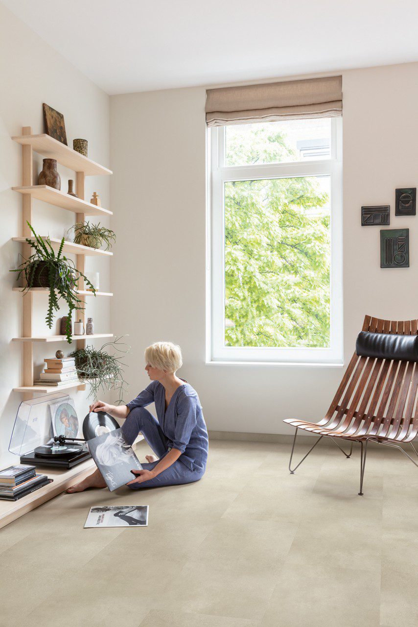 Verabschieden Sie sich von Feuchtigkeitsproblemen – mit dem wasserfesten Quick-Step Beton Vinylboden mit verstärktem starren Kern.