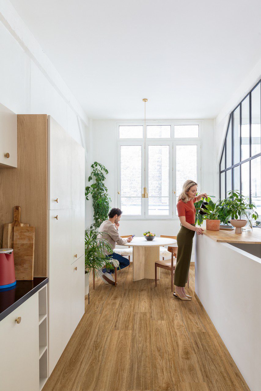 • Vinyylilattia Quick Step Bloom Wild Spotted Gum asennettuna keittiön lattialle, mies istuu ruokapöydän ääressä ja katsoo puhelinta, nainen kastelee keittiötasolla olevaa ruukkukasvia.